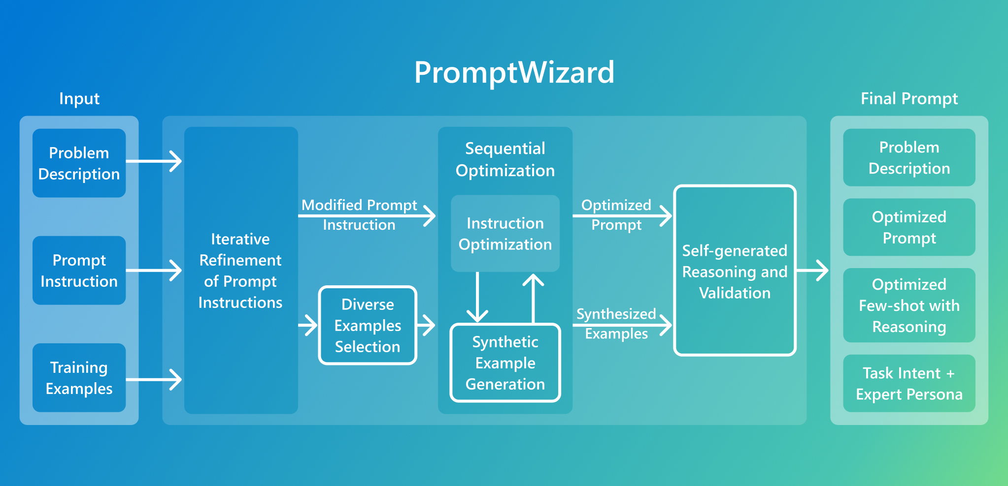 PromptWizard is a self-evolving framework that automates prompt optimization by iteratively refining instructions and in-context examples using feedback from LLMs. It jointly optimizes prompts and examples, incorporates expert reasoning, and adapts dynamically to diverse tasks—delivering high-quality prompts in minutes instead of months.